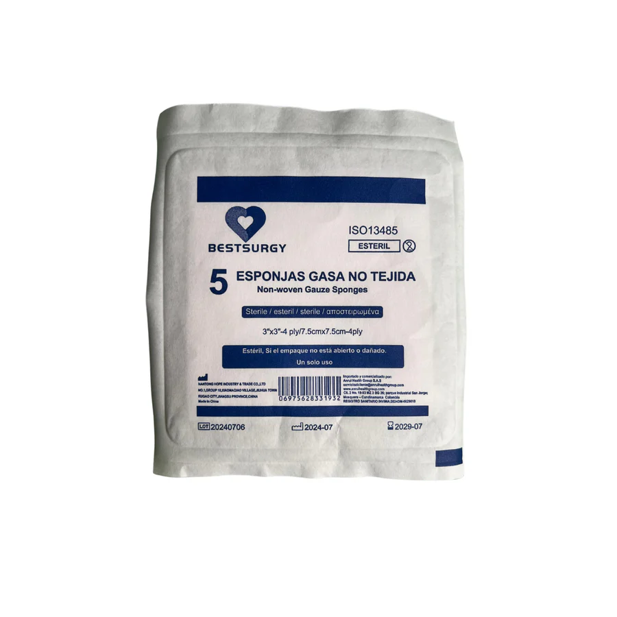 Gasa No Tejida Estéril 7.5 x 7.5 cm Sobre x 5 Unidades, diseñada para uso médico en procedimientos que requieren higiene, absorción y protección de heridas. Fabricada con fibras no tejidas que garantizan baja liberación de pelusa y alta capacidad de absorción.